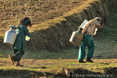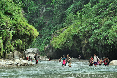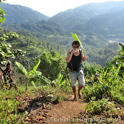 Schon der Fußmarsch in die Projektregion war für mich Europäer ein Erlebnis. Es ging durch eine tiefe Schlucht, mit unzähligen Flussdurchquerungen und erst nach einer steilen, kraftraubenden Aufstiegsetappe erreichten wir das eigentliche Projektgebiet. Dass Leben dort oben war wirklich nicht mit dem mir Vertrauten zu vergleichen. Eher fühlte man sich wie in einem Zeitsprung um Jahre in eine andere Epoche versetzt.