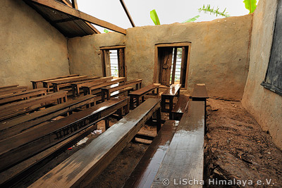 58 Schüler/innen drängen sich in dem 3 x 4 m großen Raum. Nur spärlich gelangt Tageslicht durch das einzige Fenster. Um zu den hinteren Plätzen zu gelangen, müssen die Schüler über die Bänke klettern; die einzige mobile Tafel teilen sie sich mit dem Nachbarklassenraum ...