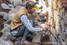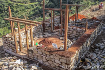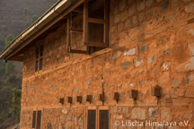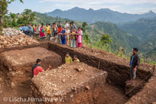 Die sechsmonatige indische Grenzblockade (2015/2016) und die damit entstandene Materialknappheit verzögerten zusätzlich den Baubeginn. Als alle Baumaterialien organisiert und die durch Nachbeben sowie die ausgeprägte Regenzeit immer wieder zerstörte Piste in unsere Projektregion wieder repariert war, konnte der Bau unseres Modellhauses beginnen.