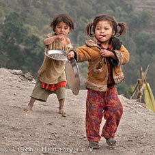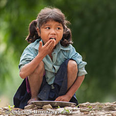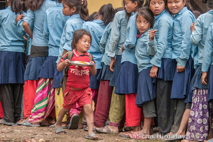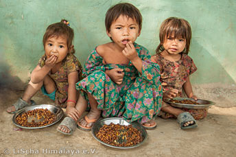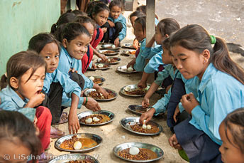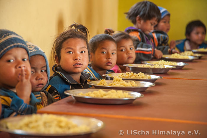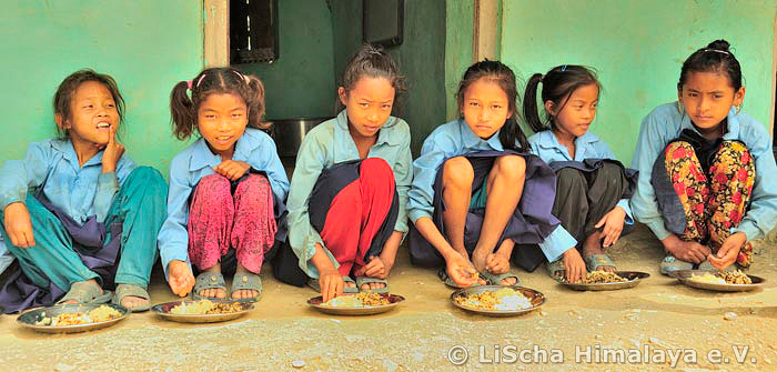 Meenu, Sargan und Dudumaya, Audhimayas Kinder, sowie den anderen SchülernInnen ist die Freude über das tägliche Essen anzusehen. Jeder Teller ist bis auf das letzte Krümelchen leer gegessen und alle Augen strahlen. Es gibt jeden Tag etwas anderes: Hülsenfrüchte, Reis, Gemüse, Obst, Tofu ... – alles darauf abgestimmt, die Mangelernährung auszugleichen und positiv auf das Wachstum und die Entwicklung der Kinder Einfluss zu nehmen.